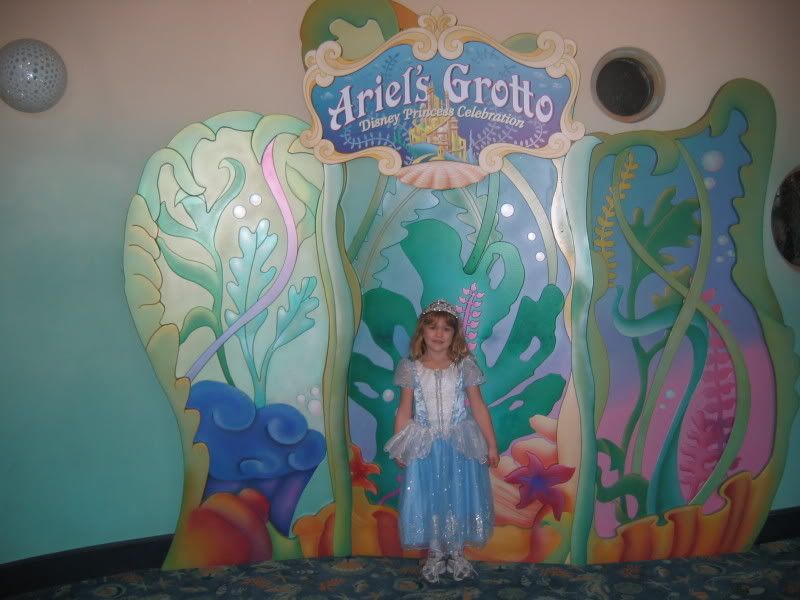 So, when we decided to take this trip the first thing that Cori said we had to do was take Mikayla to lunch with the princesses at Ariel's Grotto. Ariel's Grotto is a restarant in California Adventure where you eat your meal while being visited by each princess. When we called over a month ago to get our reservation we found that space was already pretty full and the only time we could do it was at 3:5o! kinda a weird time for a meal but we grabbed it. Mikayla was all dressed up in her fabulous Cinderella dress that Cori got for her and we were off!