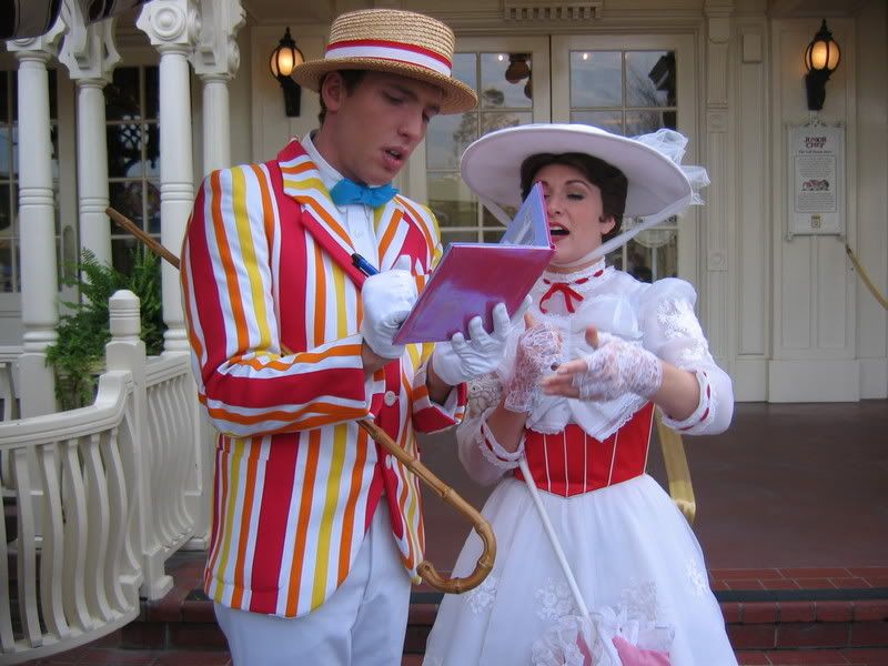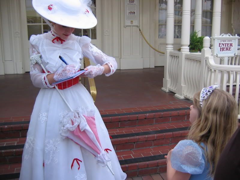 ok, I may have misspelled it but you all know what's coming! The first characters we saw at the park were Mary Poppins and Bert! Mikayla just this year decided that she loves Mary Poppins and I catch her singing "it's a jolly holiday" once in a while so to turn the corner and see them was just SO fun! Cori took off like a shot and went and bought an autograph book and a pen for Miss Mikayla to be able to get signatures! It was so cute. We tried to get her to talk like they do in the movie but she was a little shy about the whole thing.