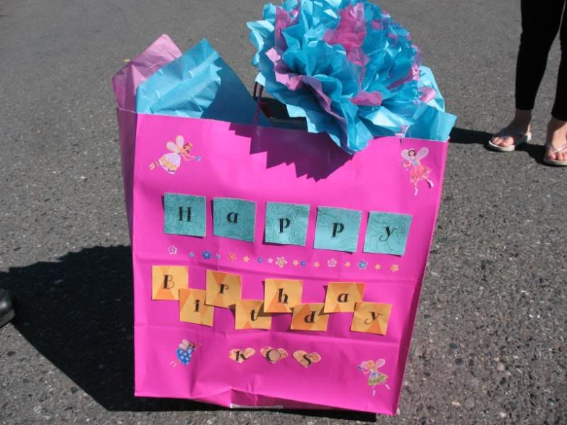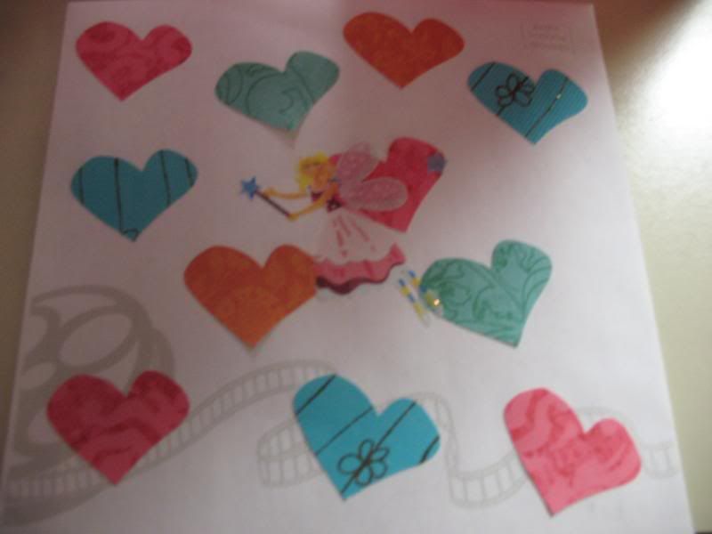 Mikayla and I decorated her present Saturday night. We used leftover papers from a craft project and new fairy stickers! Mikayla did all the flower stickers and helped me punch all the hearts out with our heart punch. We made a huge mess but man was this one cute present! I love the martha stewart pom pom on top. it came out SO cute!
