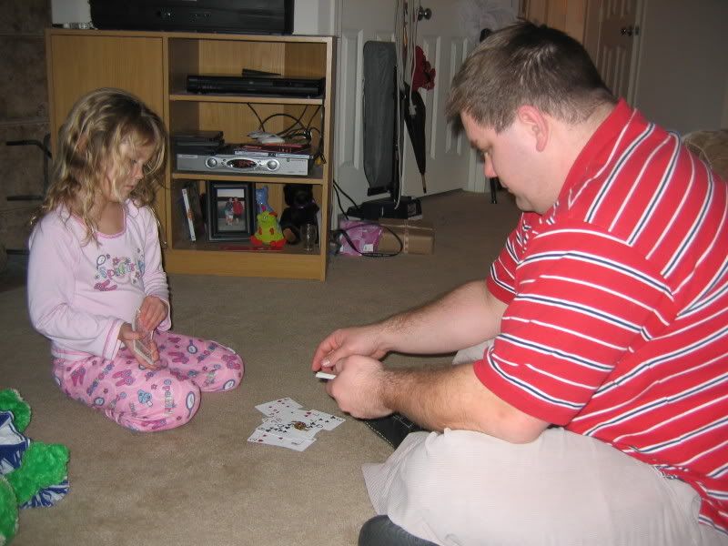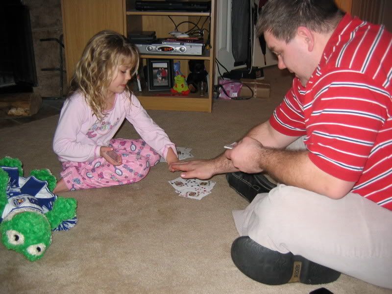 We have a new game! Mikayla and Keith are playing slapjack! you split the card deck in half and one at a time put a card down until you see a jack and you SLAP it! first hand on the cards gets whatever is under it and the most cards at the end is the winner. Way fun to watch these two!