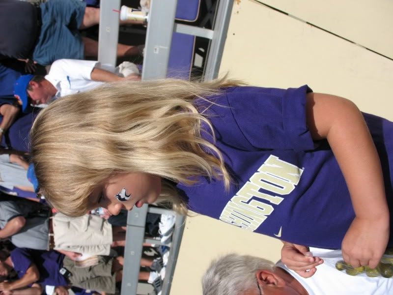 Well, this week, we had a treat. Dad and I took Mikayla to her first HUSKY GAME! I went out and got her her own special t shirt and face tattoo, I even tried to teach her how to make a W with your fingers to cheer properly. Saturday, we went and picked up Deano (my dad, it's what she calls him, I love it) and headed to the park and ride to get the bus. To say that she had never seen anything like what she was about to see is indeed the understatement of the year. She saw more purple on the way to the bus, then crammed on the bus, it was quite a way to start her out.