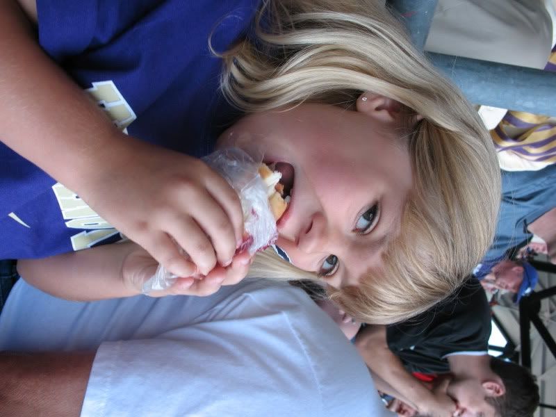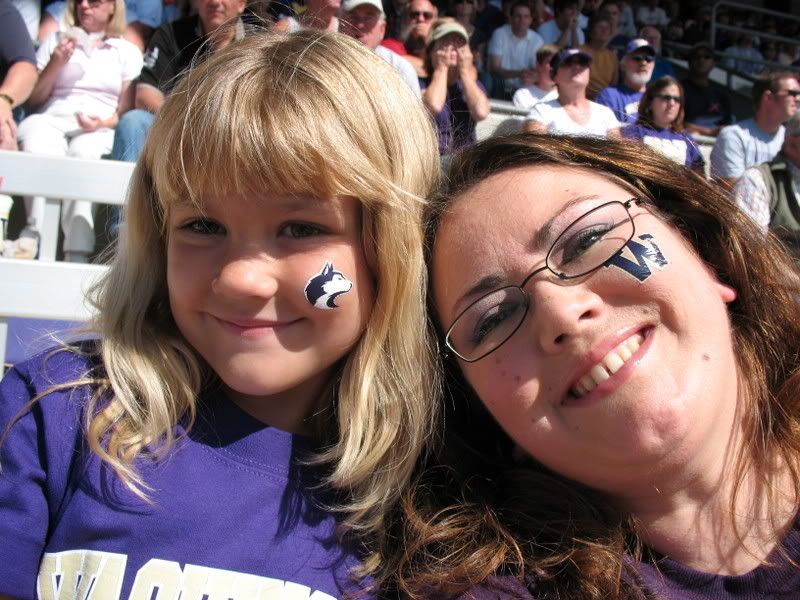 We arrived at the field and headed in, fought our way through all the purple to our seats and Mikayla went right to cheerleader watching. she loved it! We went out at half time and saw my friend Sean who is an officer with the UW police department, it was SO fun to see him. and headed back up to our seats.